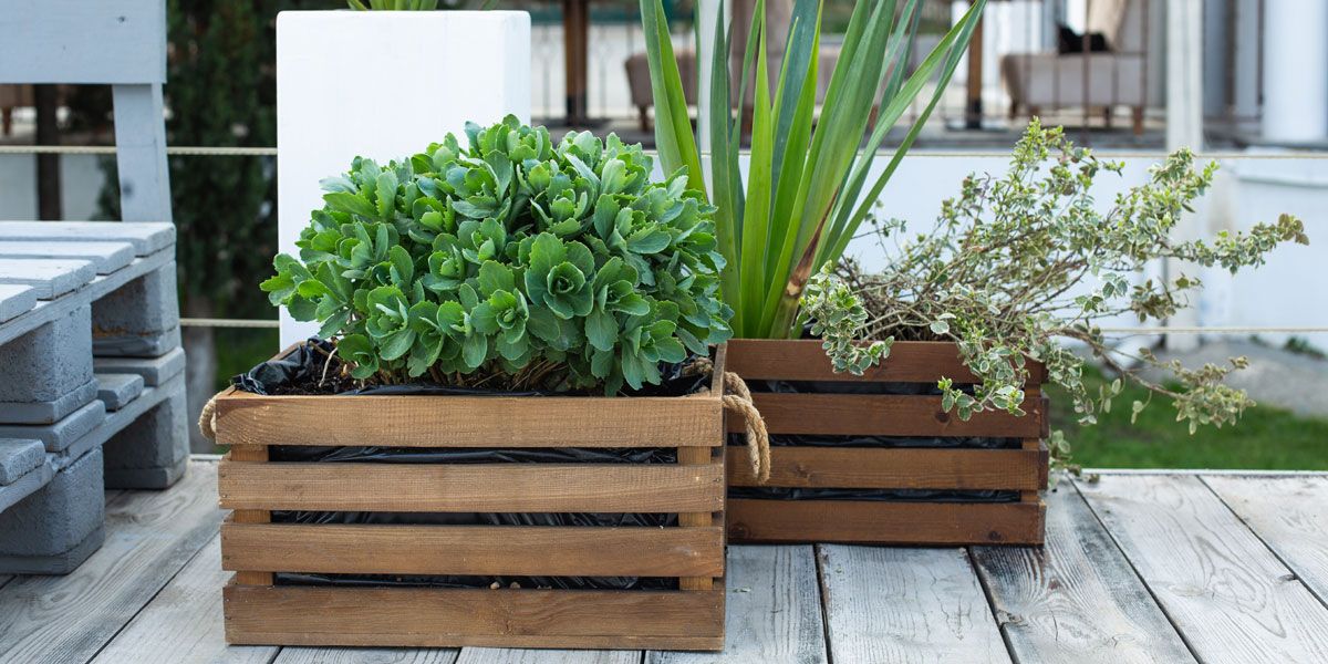 Ajoutez ensuite la bâche à l'intérieur, en la fixant à 5 cm du bord supérieur, et percez des trous pour le drainage. Placez la jardinière à l'endroit souhaité, ajoutez un fond de graviers ou de pouzzolane, puis remplissez de terreau. Il ne vous reste plus qu'à planter !