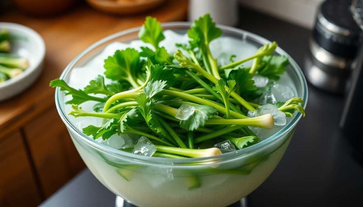 Un bain d'eau glacée après le blanchiment crée un choc thermique qui stoppe la cuisson, empêchant la dégradation des enzymes responsables de la perte de couleur et de nutriments.