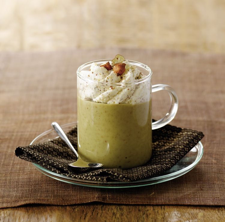 - Versez la crème de lentilles chaude dans des tasses, puis complétez avec la crème chantilly à la noisette.