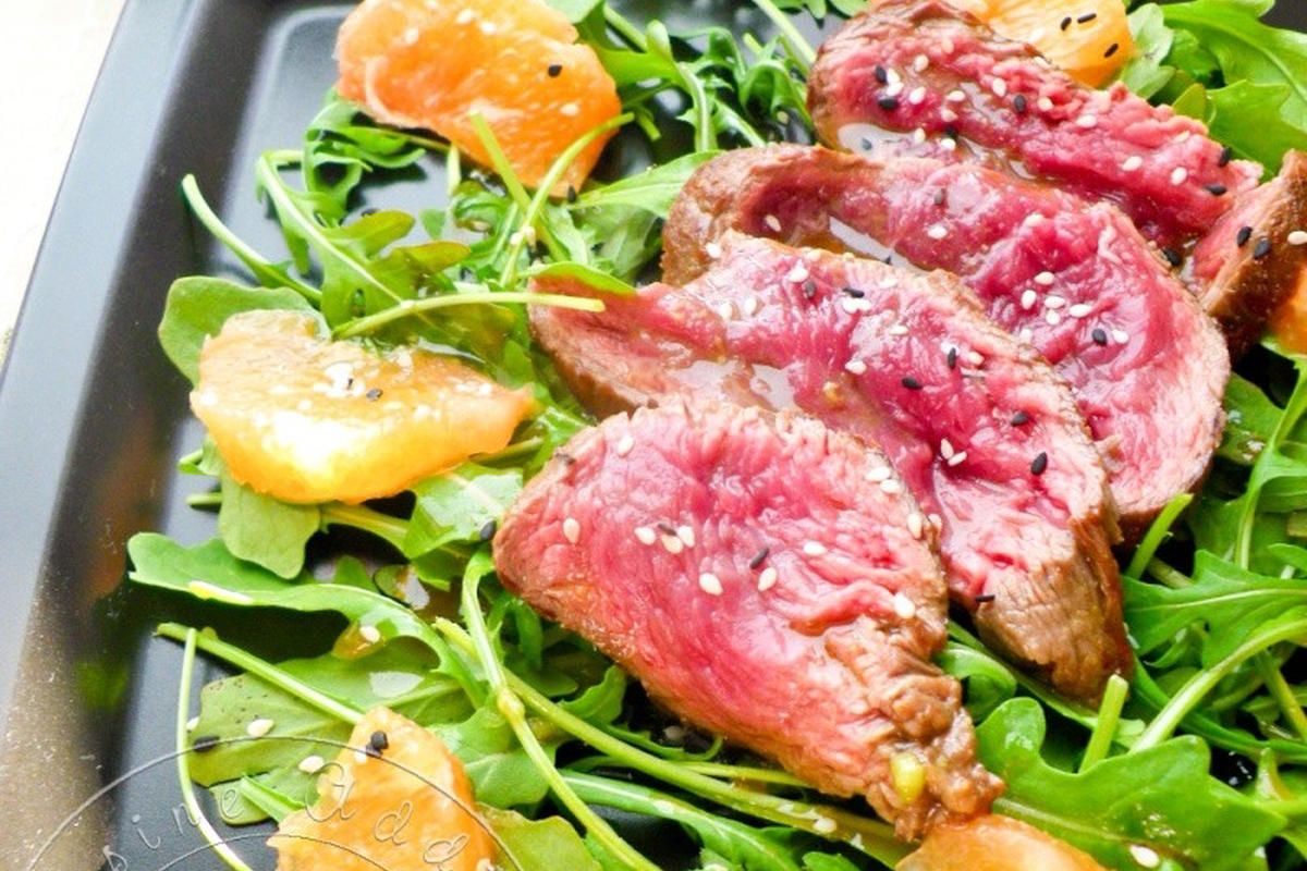 - Tranchez le boeuf en fines lamelles, déposez-le sur la roquette, arrosez de sauce et parsemez de graines de sésame.