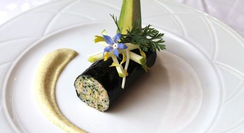 1 gros tourteau (1 kg), 1 citron vert, 20g de gingembre, 1 paquet d'algues noires nori, 1 tube de moutarde wasabi, 1 avocat moyen, 1 pomme Grany Smith, 1/2 botte de ciboulette, 1 barquette de shiso, 1dl d'huile d'olive extra.